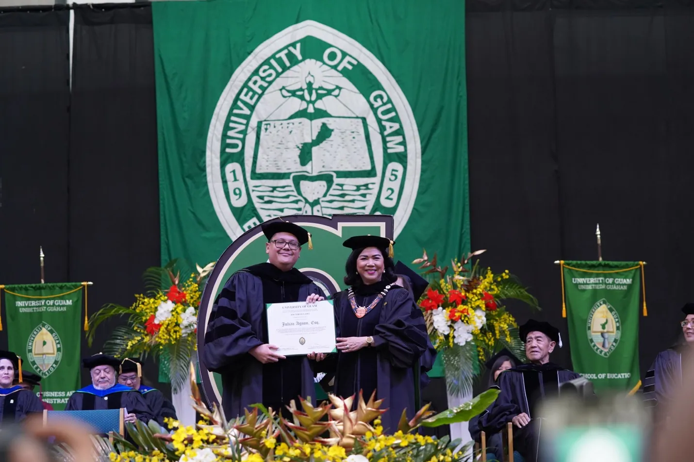The University of Guam conferred an honorary Doctor of Laws degree to international human rights attorney and author Julian Aguon. A Pulitzer Prize finalist and Right Livelihood Award laureate, Aguon is founder of Blue Ocean Law, a progressive law firm that focuses on Indigenous rights, environmental justice, and self-determination in the Pacific region.