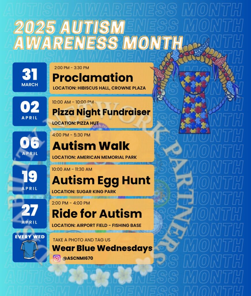 For more information about upcoming Autism Awareness Month events and activities, contact Clarice Arriola or Shawna Babauta at autismsocietycnmi@gmail.com/.