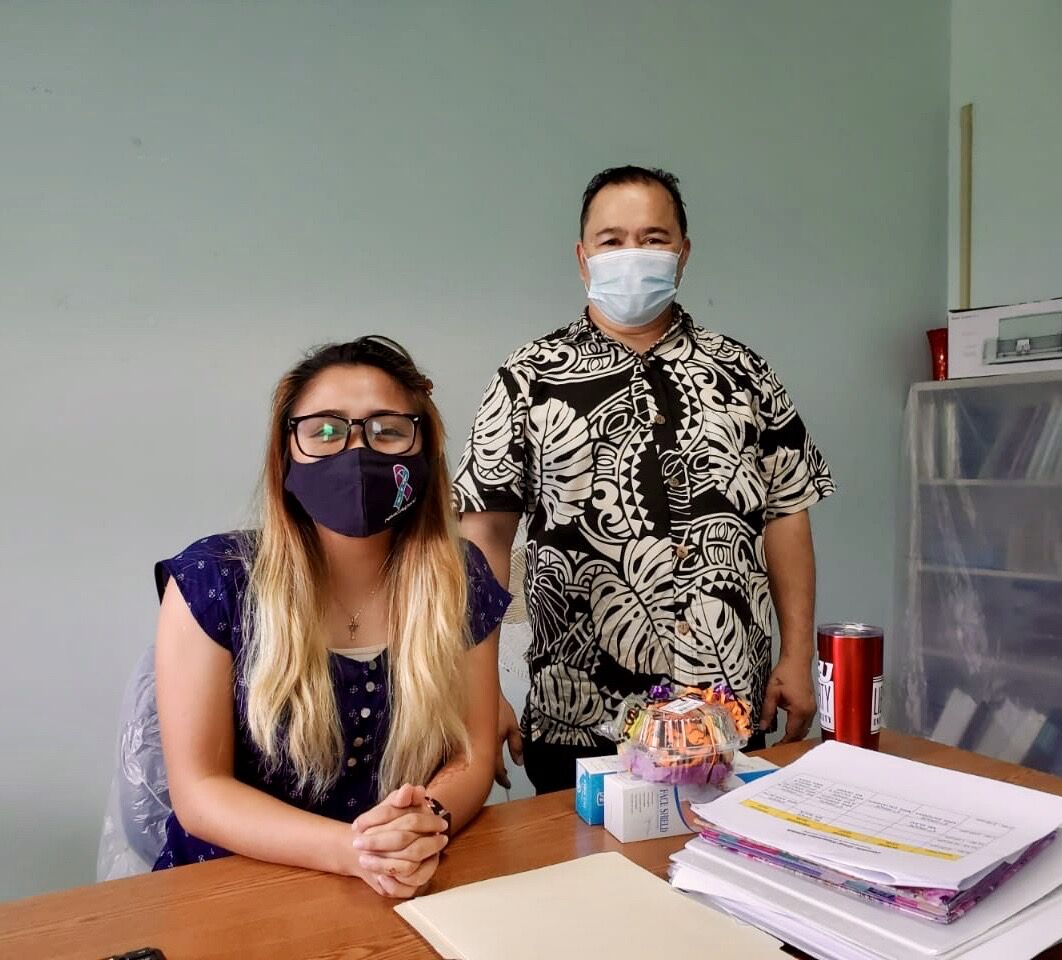 Education Commissioner Dr. Alfred Ada poses with a Sinapalo Elementary School staff member.