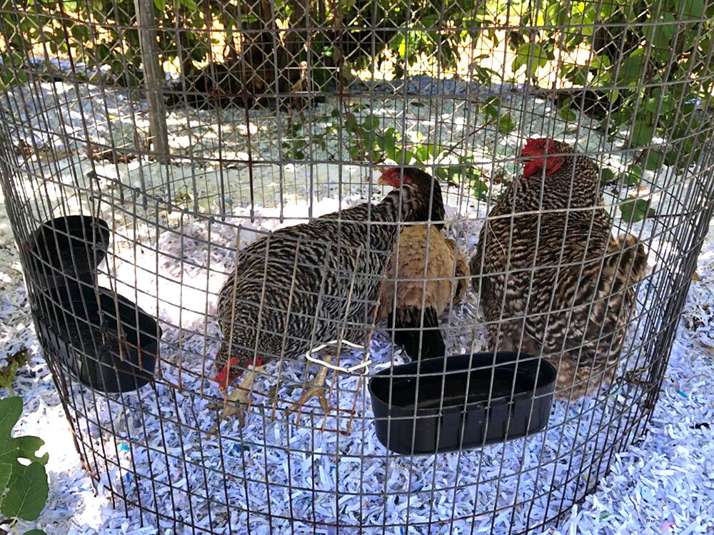 Egg-laying hens sit on dry litter bedding in a wire scratching pen. Dry litter, such as shredded paper or dried leaves, is recommended for stationary chicken pens, as it provides comfort, cleanliness, and odor control. It can also be used as nutrient-rich mulch for gardens when it is changed out.