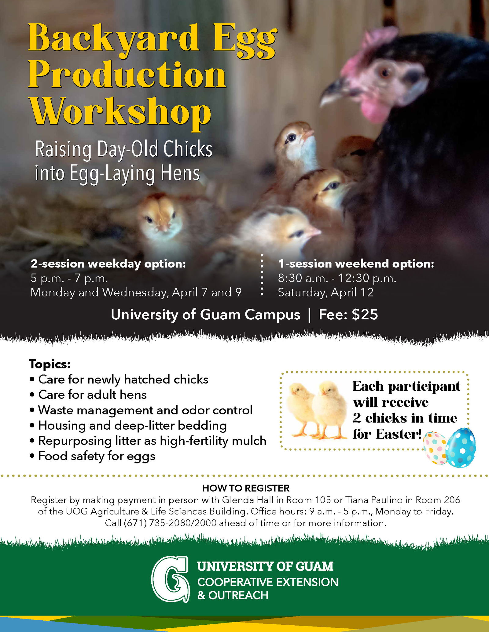To register, please stop in during working hours to the Agriculture & Natural Resources extension office in Room 105 or the College of Natural & Applied Sciences administrative office in Room 202 of the Agriculture & Life Science Building at the University of Guam. You may also call Glenda Hall at (671) 735-2080 or Tiana Paulino at (671) 735-2000 to reserve a space, however payment must be made in person to secure a seat.