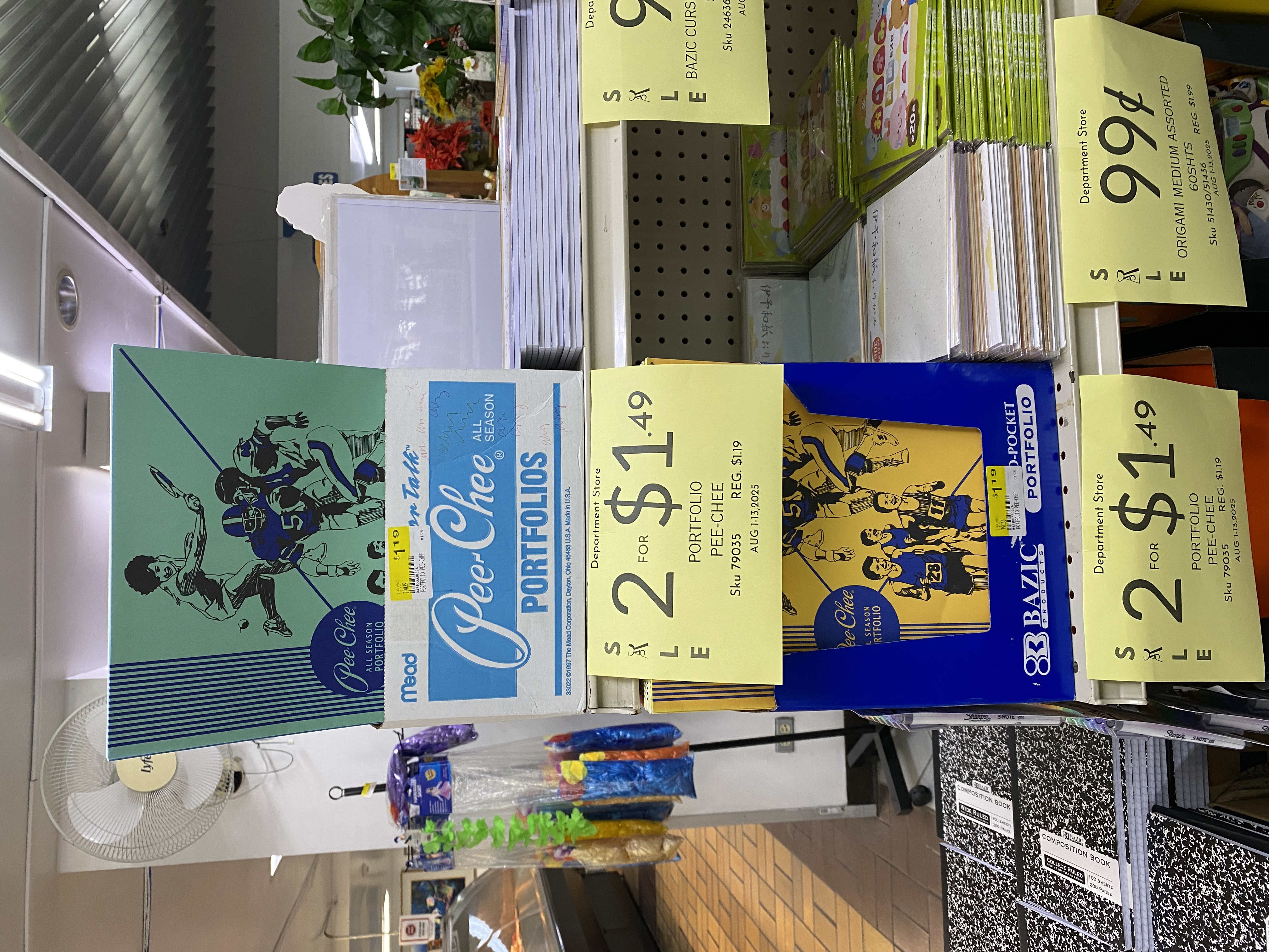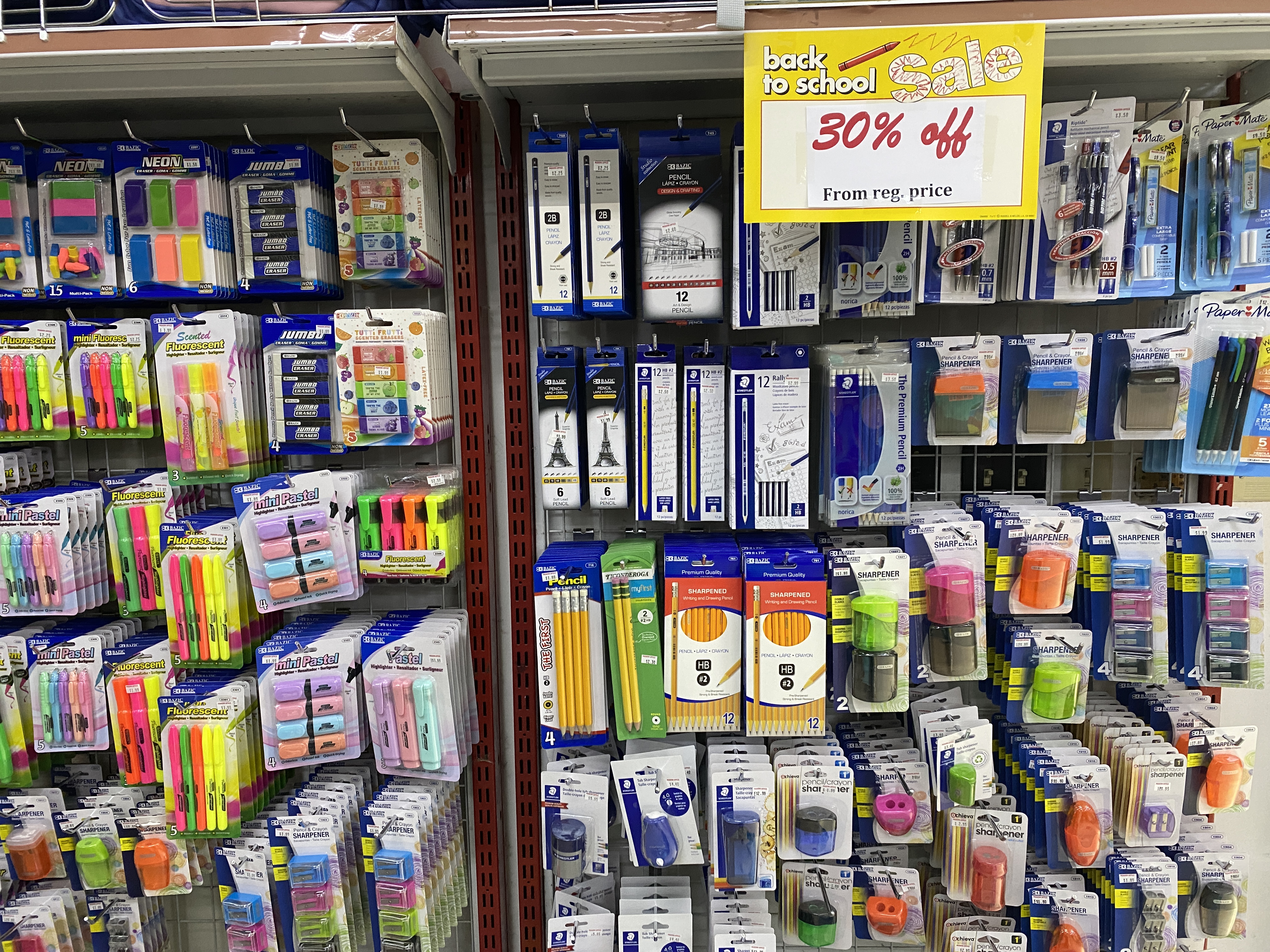 At National Office Supply, white tags on items like notebooks, crayons, and scissors get the 30% discount, while orange-tagged items tell you they are priced regularly and the promo does not apply.