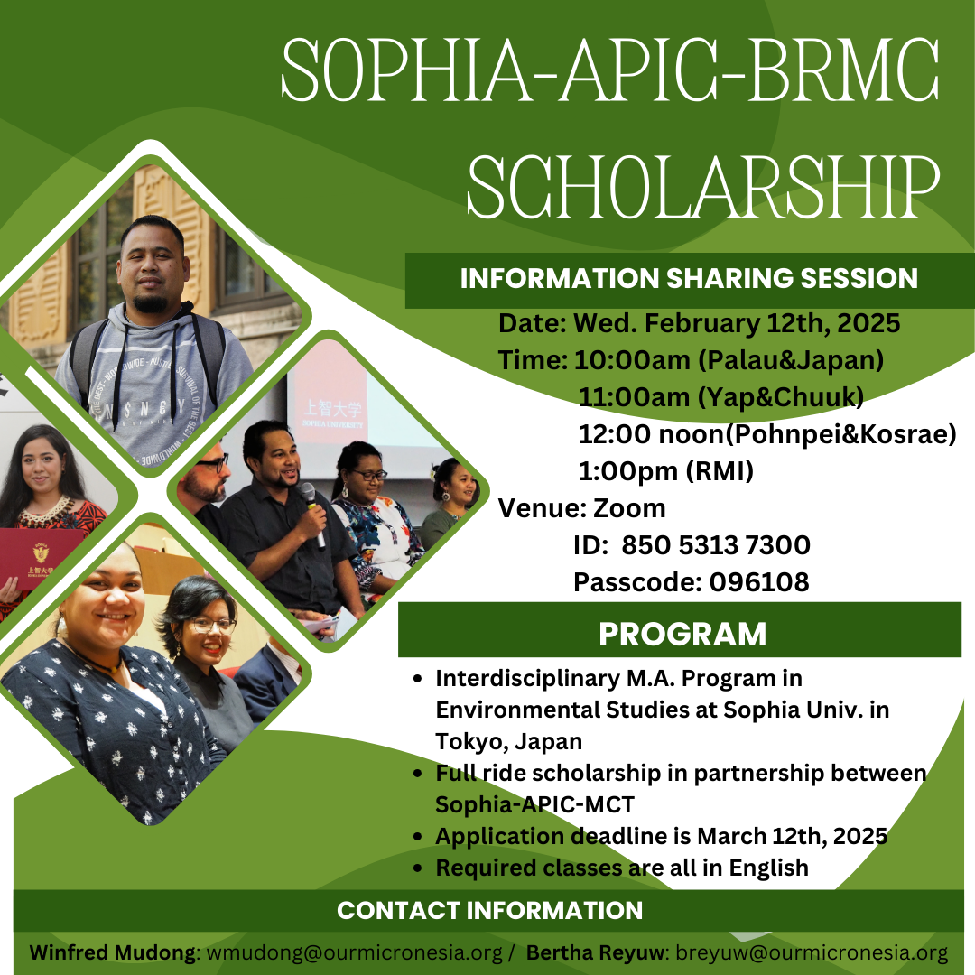 The scholarship will pay all expenses to earn a Master’s Degree in Global Environmental Studies from the prestigious Sophia University’s Graduate School of Global Environmental Studies in Tokyo, Japan. The full-ride scholarship is offered by Sophia University, the Association for Promotion of International Cooperation, a private foundation based in Tokyo, and the Micronesia Conservation Trust.