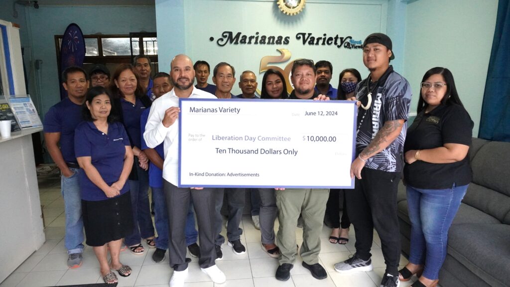 Marianas Variety President Amier C. Younis and Liberation Day Committee Chair Delbert Pua hold a ceremonial check for $10,000, representing MV’s in-kind donation to this year’s festivities.