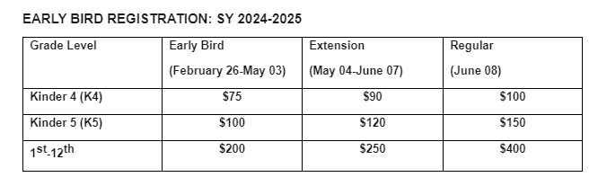 “We are providing the following forms of financial assistance to our families:  Early Bird Discount: $75 per K4 student (regular $100), $100 per K5 student (regular $150), and $200 per 1st—12th grade student (regular $400) — Deadline: May 3, 2024.”
