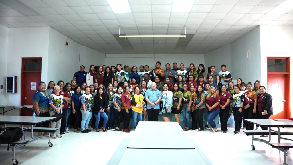 Dr. Rita H. Inos Junior-Senior High School and Sinapalo Elementary School staff and personnel pose for a photo with Commissioner of Education Dr. Lawrence Camacho.