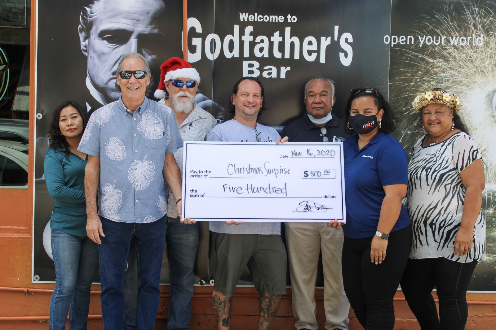 Godfather’s Bar donates $500 to “A Christmas Surprise on Saipan,” an initiative for a family in need launched by Pacific Rim in media partnership with KZMI 103.9 FM and Marianas Variety, and in collaboration with the non-profit group Empty Vessel Ministry Foundation.