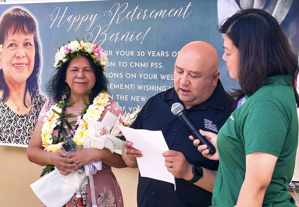 The Public School System Distinguished Service Recognition Award was presented to retiring PSS employee Bernardita “Bernie” Deleon Guerrero Calvo by Commissioner of Education Dr. Lawrence F. Camacho and PSS Federal Programs Officer Jacqueline Che at a ceremony on Thursday. Calvo worked for the PSS Federal Programs Office for 30 years, from June 1, 1994 to May 29, 2024. PSS commended her for her “high moral and ethical work standards,” as well as her “trustworthiness and reliability.” Happy retirement Bernie!