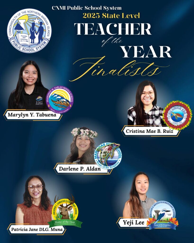 (PSS) — Education Commissioner Dr. Lawrence F. Camacho and Human Resources Officer Lucretia B. Deleon Guerrero have announced the Public School System’s five finalists for the 2025 CNMI Teacher of the Year award.