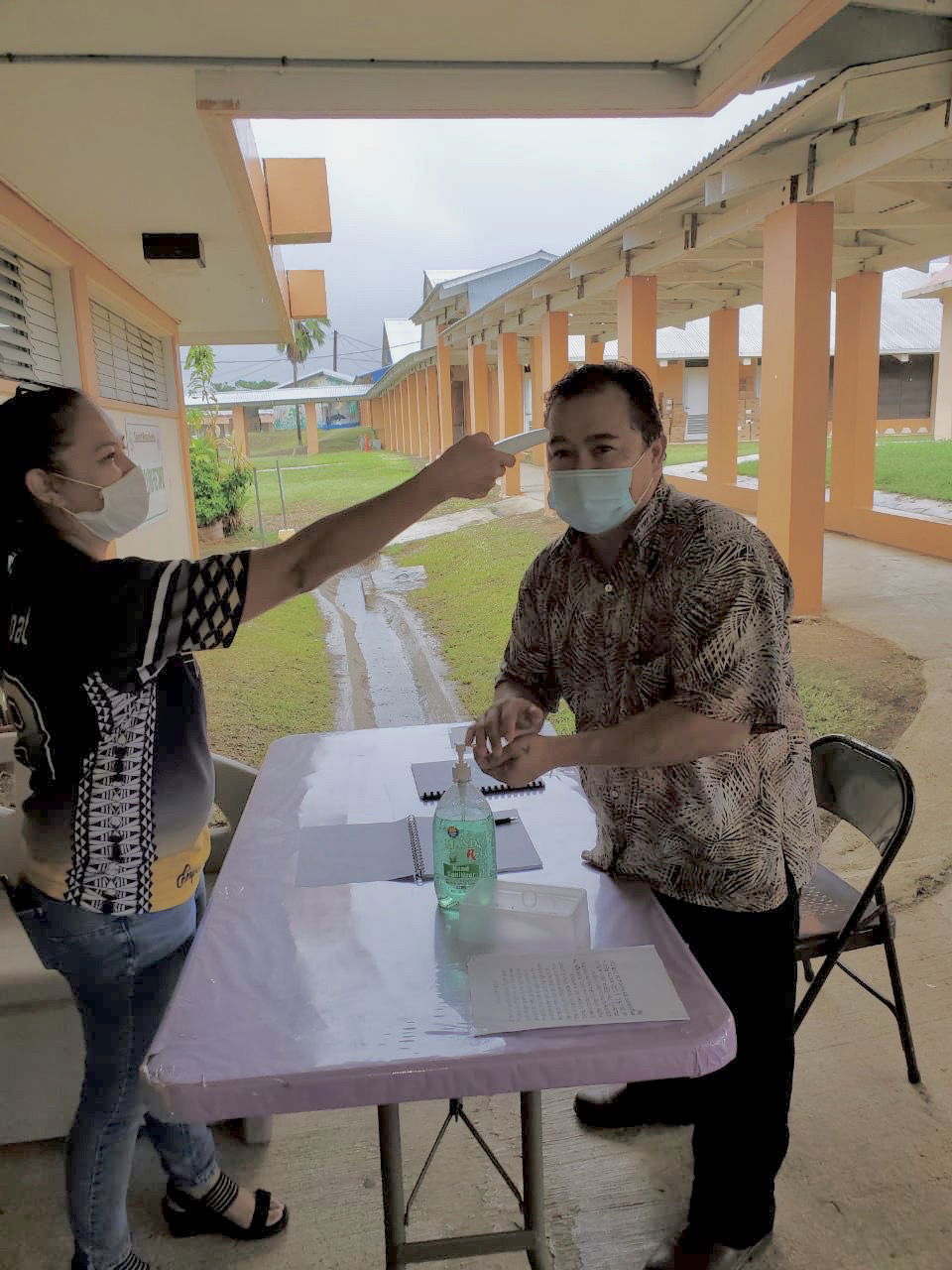 At Tanapag Middle School, principal Hilda Rios checks the temperature of Commissioner of Education Dr. Alfred Ada.