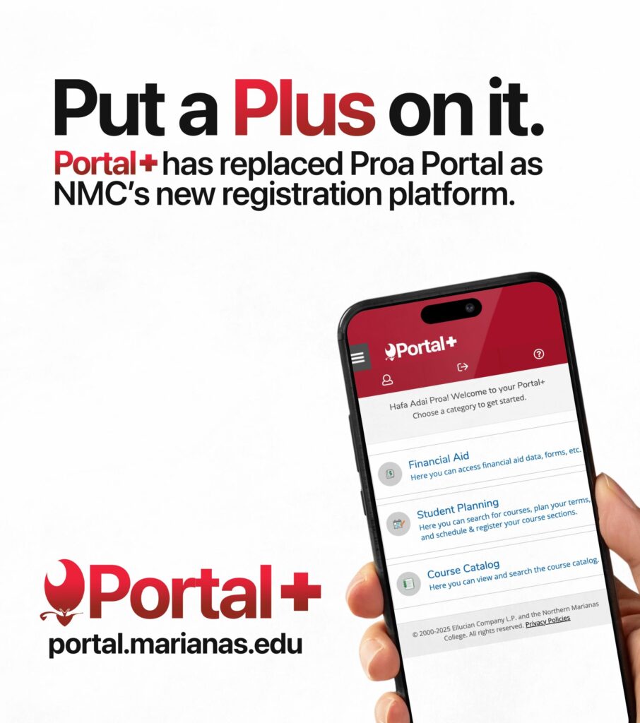 Current students who need help with registration or Portal+ access can visit Project PROA at Building O (Archives) or submit a ticket through the NMC Student Helpdesk. Before registering, students should also check their “Stop List” on the portal to clear any outstanding holds related to financial aid, academic advising, or other requirements. More information, along with a step-by-step registration guide, is available at www.marianas.edu/register/.