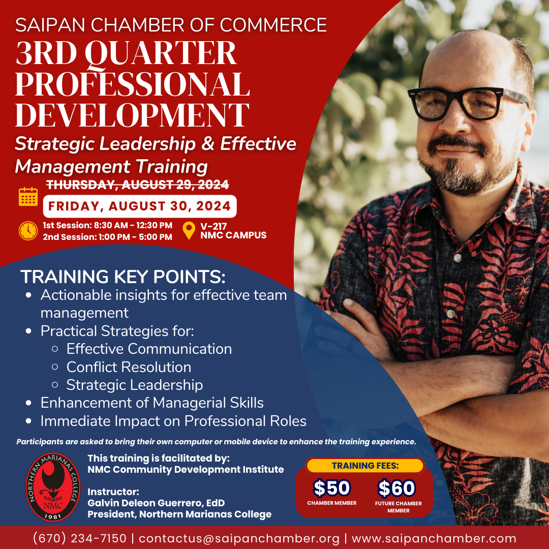 (SCC) — Don’t miss out on the Saipan Chamber of Commerce’s 3rd Quarter Professional Development Training on “Strategic Leadership & Effective Management,” taking place on Friday, Aug. 30, 2024, at V-217 on the NMC Campus. The training will be offered in two sessions: the first session will begin at 8:30 a.m. to 12:30 p.m. and the second will start from 1 p.m. to 5 p.m.