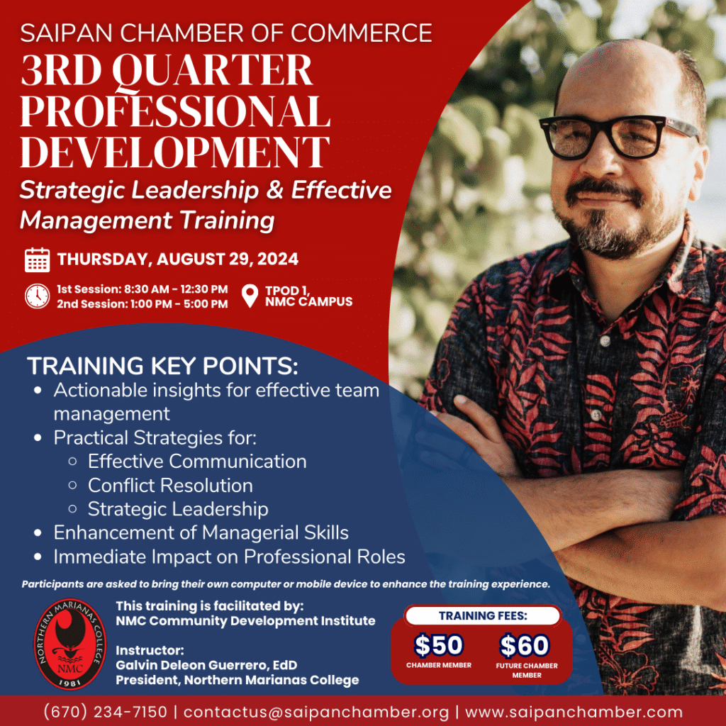 (SCC) — The Saipan Chamber of Commerce is inviting members of the public to its 3rd Quarter Professional Development Training, titled “Strategic Leadership & Effective Management,” scheduled for Thursday, Aug. 29, 2024. The event will take place at TPOD 1 on the Northern Marianas College campus.