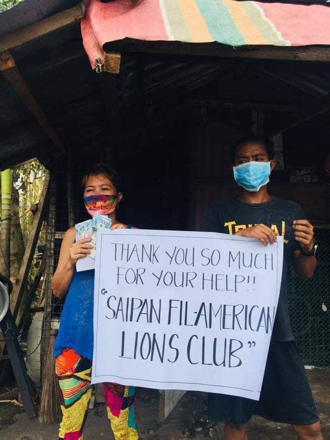 Through the assistance of a member’s relative in the Philippines, the Saipan Fil-American Lions were able to provide help to three families in Naga City, south of Manila: the families of Rea Alano Manondo, Effigine Deblois Crisostomo and Leamor R. Manlangit. Each received $210.