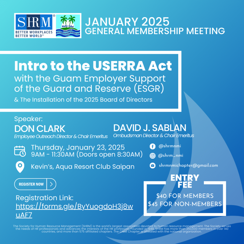 (Society for Human Resource Management) — The SHRM CNMI chapter is excited to announce its first general membership meeting of the year, scheduled for Thursday, Jan. 23, 2025, from 9 a.m. to 11:30 a.m. at Kevin’s at Aqua Resort Club Saipan. Doors will open at 8:30 a.m. for registration and breakfast.