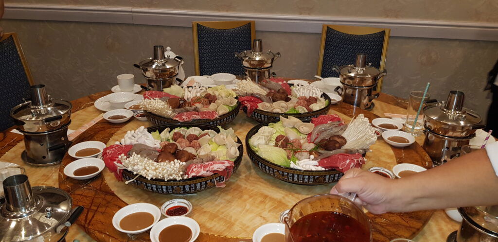Served super fresh for shabu-shabu are shrimp, shrimp balls, lamb meat, ribeye, beef balls, pork meat balls, wanton, gyoza, mushrooms and vegetables.