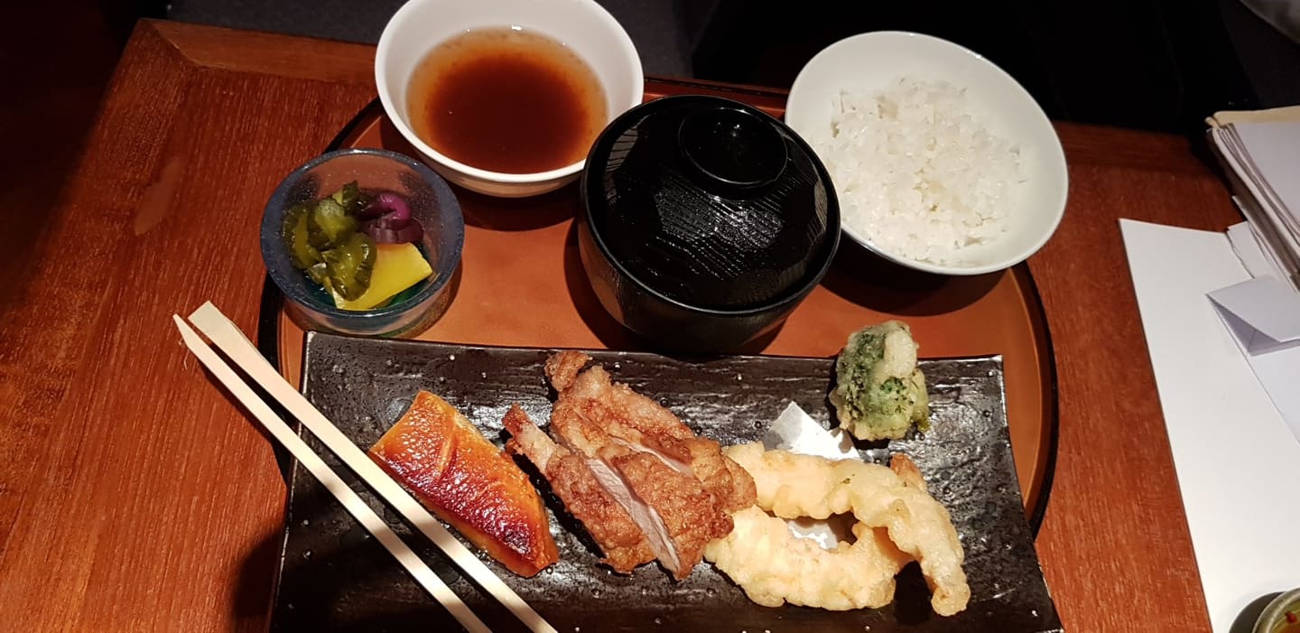 Lunch appetizers include steamed egg custard and garden salad, temari sushi, shrimp, egg, seared tuna, fresh sashimi, tempura, prawn, eggplant, okra.