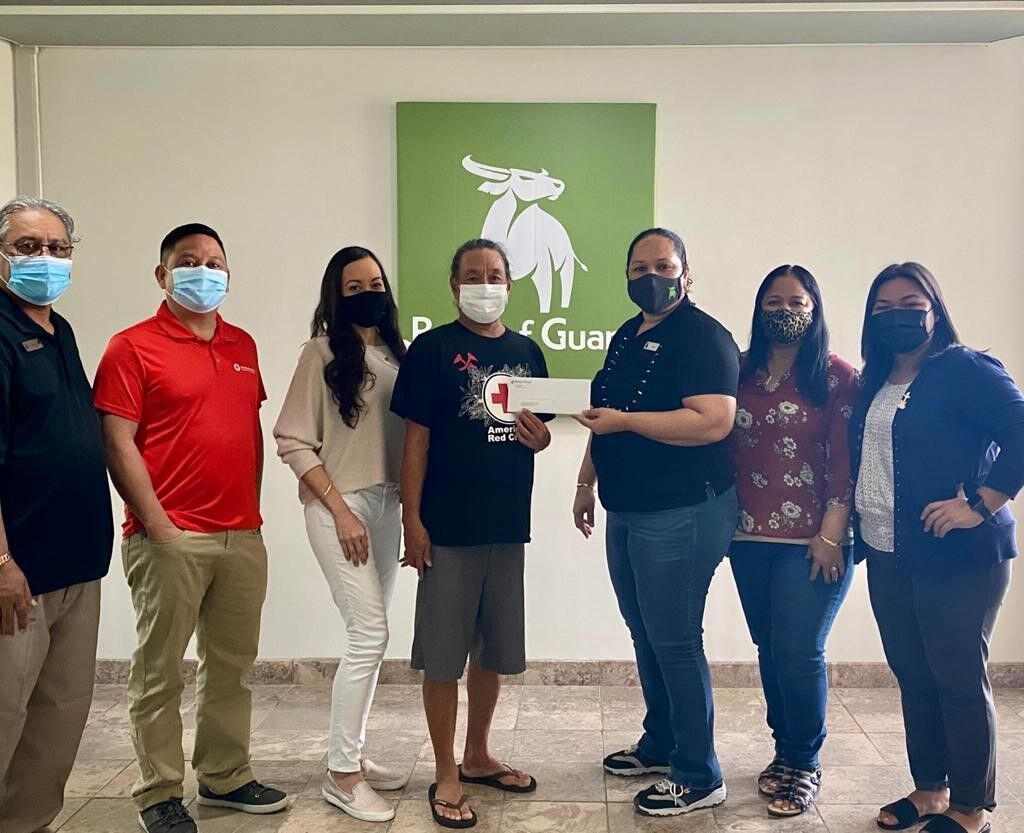 Bank of Guam has signed on as a Dolphin Sponsor with a $5,000 cash donation.  Photo shows the Bank of Guam team with the American Red Cross board members and staff.