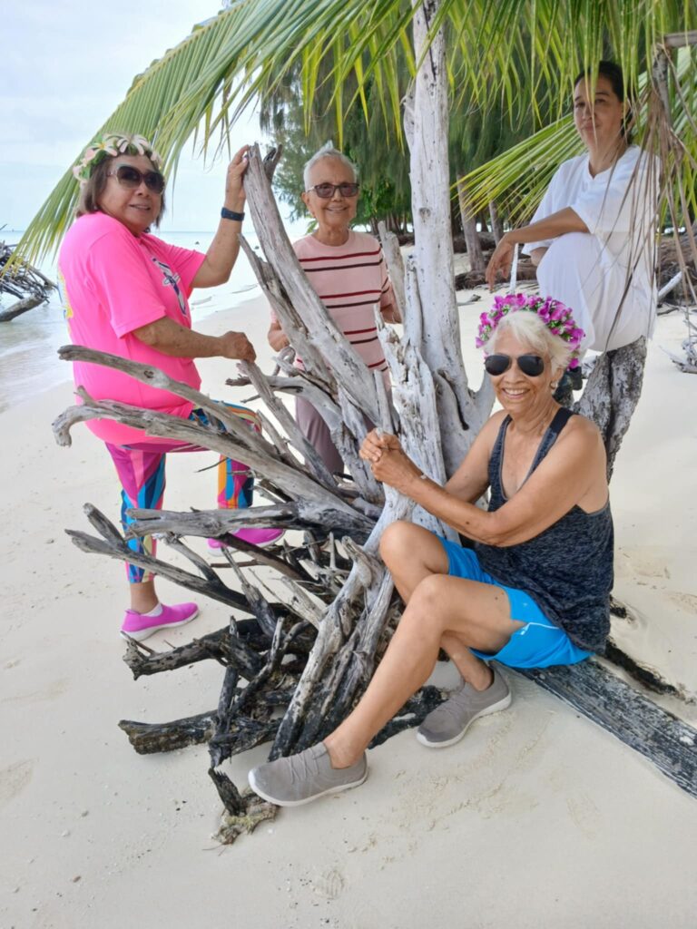 Saipan manamko’ Lupe Sabino, Lupe Borja Robinson, and Chailang Palacios recently relaxed at Micro Beach after doing tai chi with Catherine Perry, standing far right. Tai chi is offered free every Friday, 7:30 a.m. at Micro Beach Pavilion.  Based on an ancient Chinese martial art, tai chi helps promote stretching, deep breathing, and mindfulness.