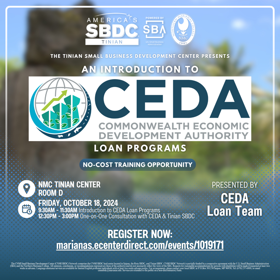 (CNMI SBDC) — The Tinian Small Business Development Center at Northern Marianas College, in collaboration with the Commonwealth Economic Development Authority, will be hosting a vital training session on Friday, Oct. 18, 2024, from 9:30 a.m. to 3 p.m. at the NMC Tinian Center, Room D. This event will feature a presentation by the CEDA Loan Department, which will provide an overview of the various loan programs available to small businesses, including the newly approved State Small Business Credit Initiative 2.0 for the Commonwealth of the Northern Mariana Islands.