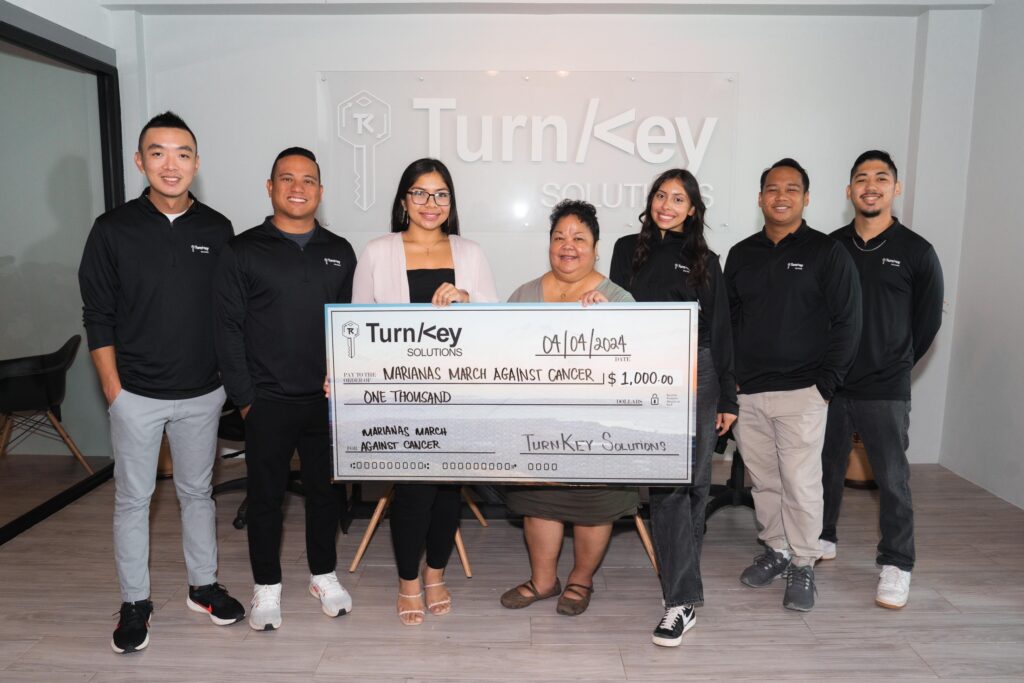 TurnKey Solutions joins the 2024 Marianas March Against Cancer as a major sponsor following an inaugural donation of $1,000. TurnKey Solutions’ generous contribution emphasizes its commitment to making a tangible impact on this critical health issue. From left, Jerry Lin, Broc Calvo, Natasha Palacios, Jocelyn F. Deleon Guerrero, Liana Cotero, Adrian Tangcoy and Tony Atalig.