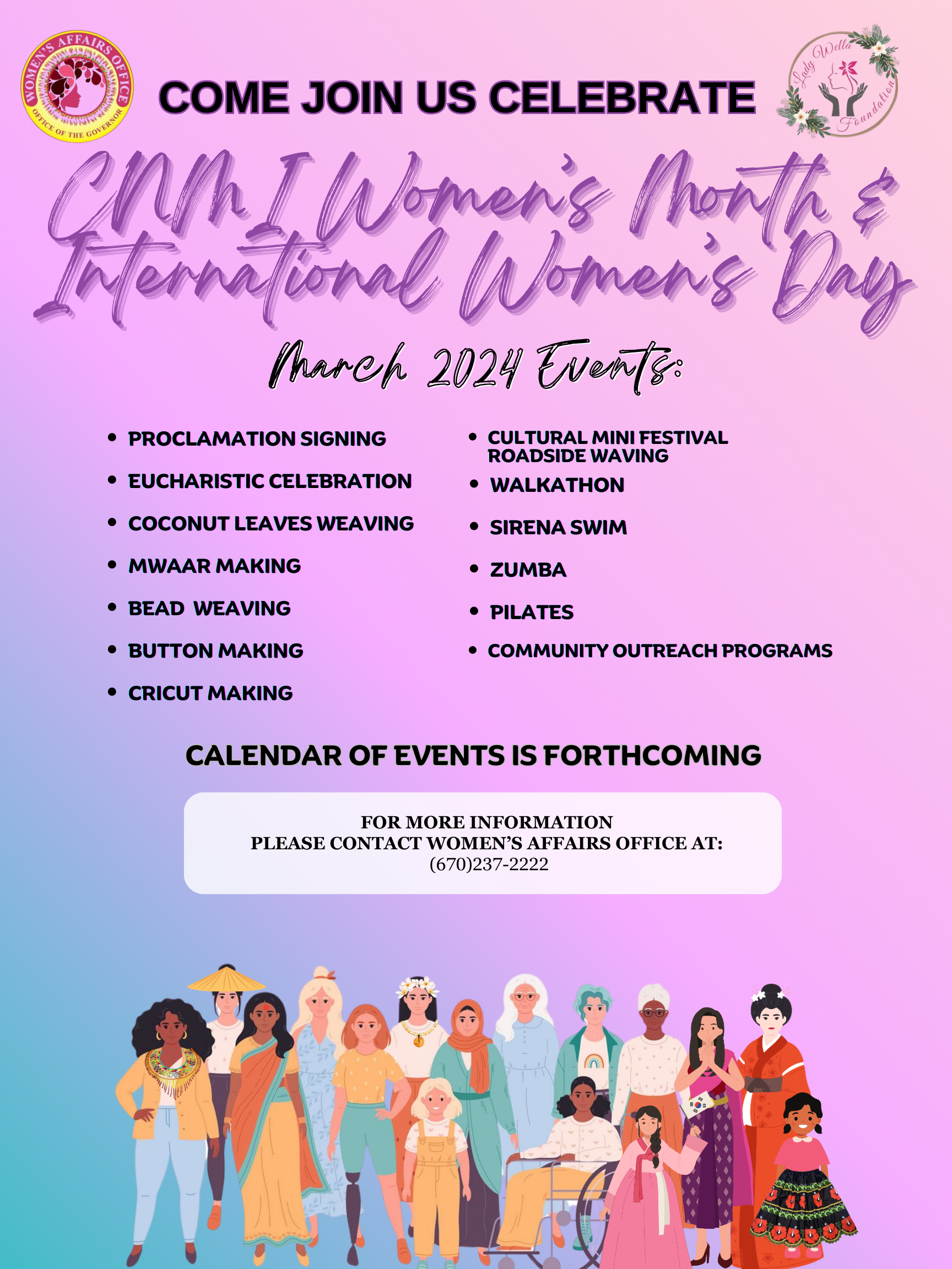To kick off the month, there will be a Women’s Month Proclamation taking place on March 1st at 10AM at the Multi-Purpose Center. On March 2nd, there will also be an optional Eucharistic Celebration held at 6PM at San Jose Church in Oleai for those interested.