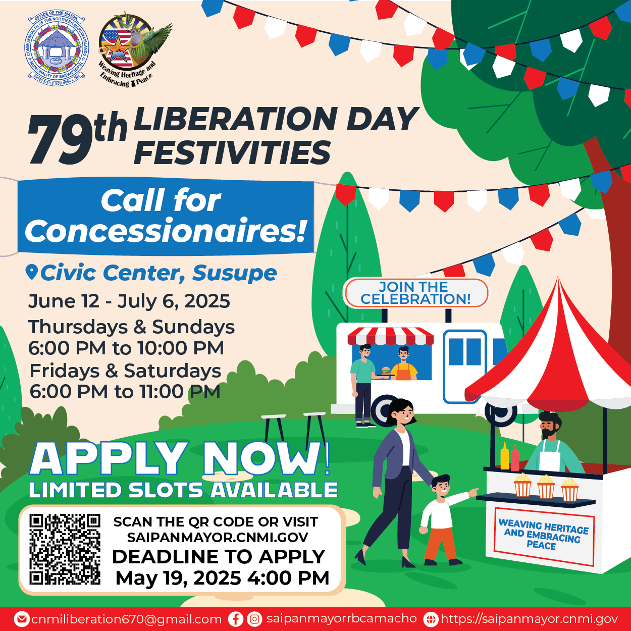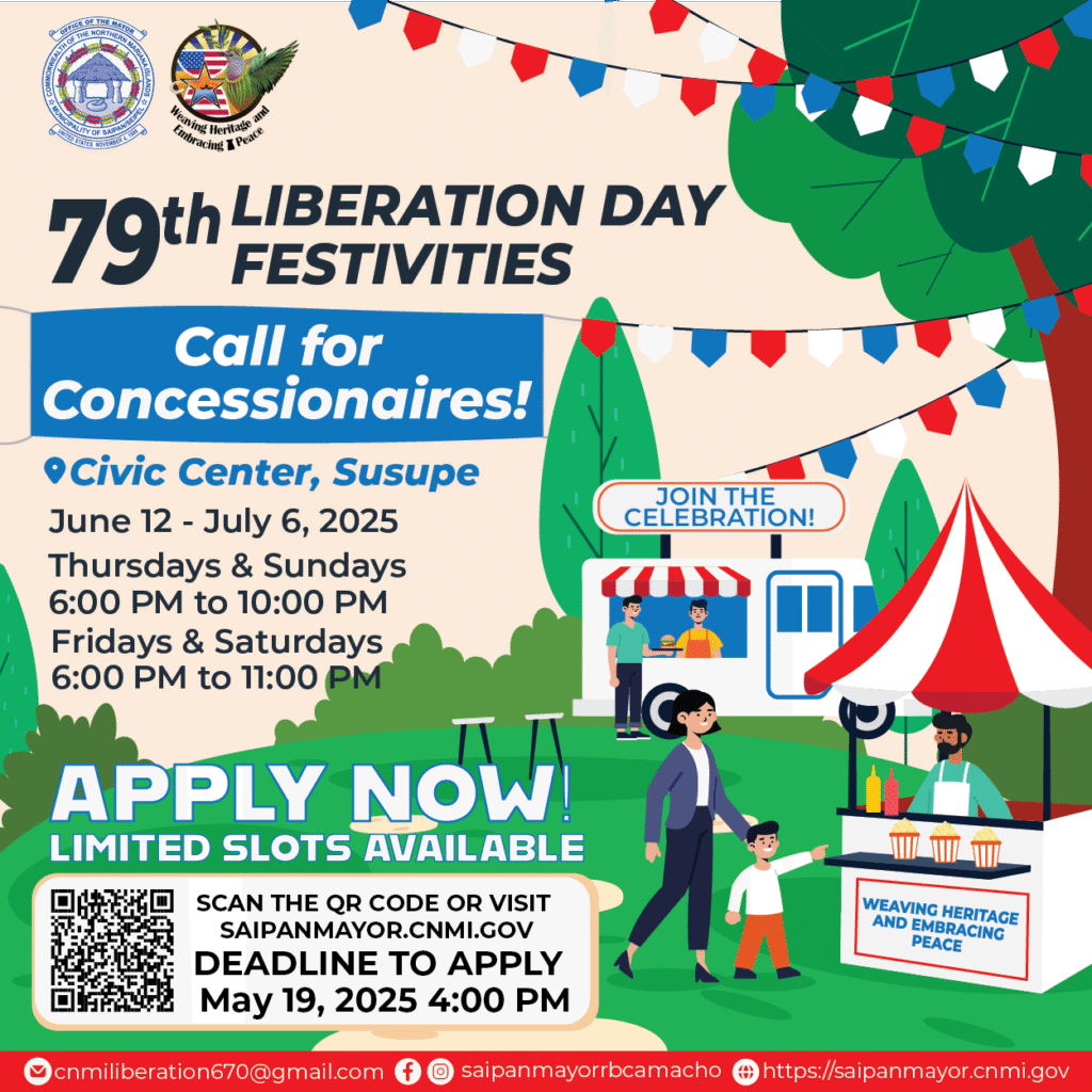 Fees, additional requirements, and application forms are now available for pick up at the Saipan Mayor’s Office or for download at https://saipanmayor.cnmi.gov/storage/2025/04/2025-CONCESSION-VENDOR-APPLICATION-2.pdf