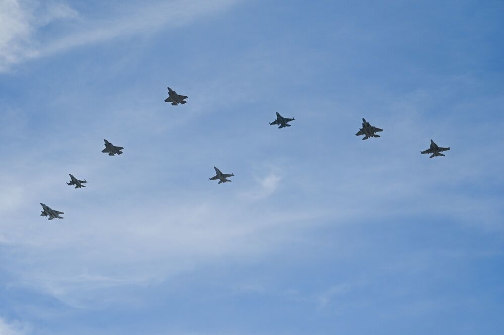 Aircraft of the U.S. Air Force, U.S. Marine Corps, Royal Australian Air Force, Japan Air Self-Defense Force and regional allies conduct a flyover during Cope North 2022 at Andersen Air Force Base, Guam, Feb. 7, 2022. Cope North is the Pacific Air Forces largest multilateral exercise.