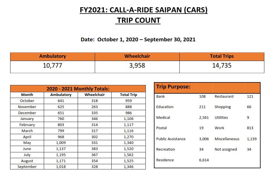 (Office of the Governor) — The Commonwealth Office of Transit Authority reported a 58% ridership increase in its Call-A-Ride Saipan Demand Responsive Shared Ride Service for fiscal year 2021 compared to last fiscal year.