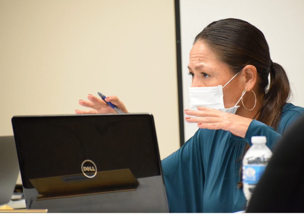 Commonwealth Ports Authority Chairwoman Kimberlyn King-Hinds speaks during a CPA board meeting in the Aircraft Rescue and Firefighting classroom.