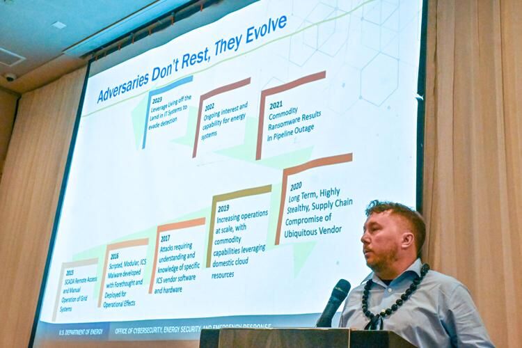 Michael Toecker, with the U.S. Department of Energy, gives a presentation at a cybersecurity conference Thursday, Oct. 19, 2023, at the Hyatt Regency Guam in Tumon.