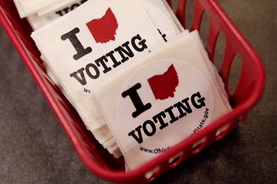 Voting stickers are seen at the Franklin County Board of Elections in Columbus, Ohio on Oct. 28, 2016.