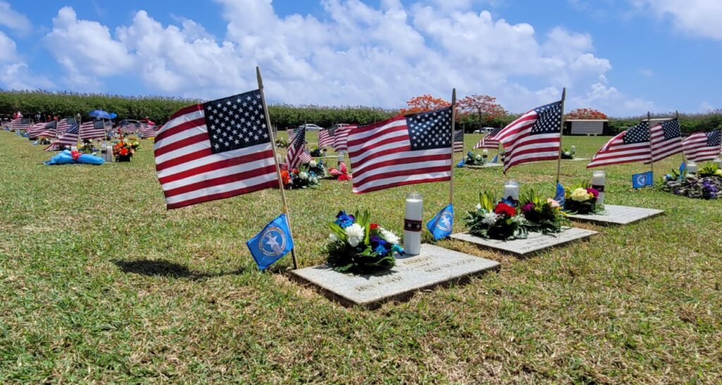 The graves at the CNMI Veterans Cemetery are  adorned with U.S. flags, CNMI flags, flowers, and a candle.
