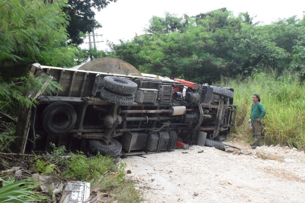 SG Auto Shop mechanic Remuel Maritano stands next to the boom truck that overturned on Earhart Drive in Gualo Rai on July 14, 2023.