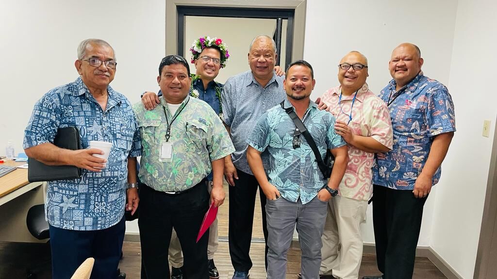 Acting Department of Public Works Secretary Ray N. Yumul, third left, with Special Assistant for Administration Oscar M. Babauta, Office of the Governor staff member Paul Reyes, Lt. Gov. David M. Apatang, House Vice Speaker Joel Camacho, Reps. Blas Jonathan Attao and John Paul Sablan after a public hearing on Tuesday in the Senate chamber.