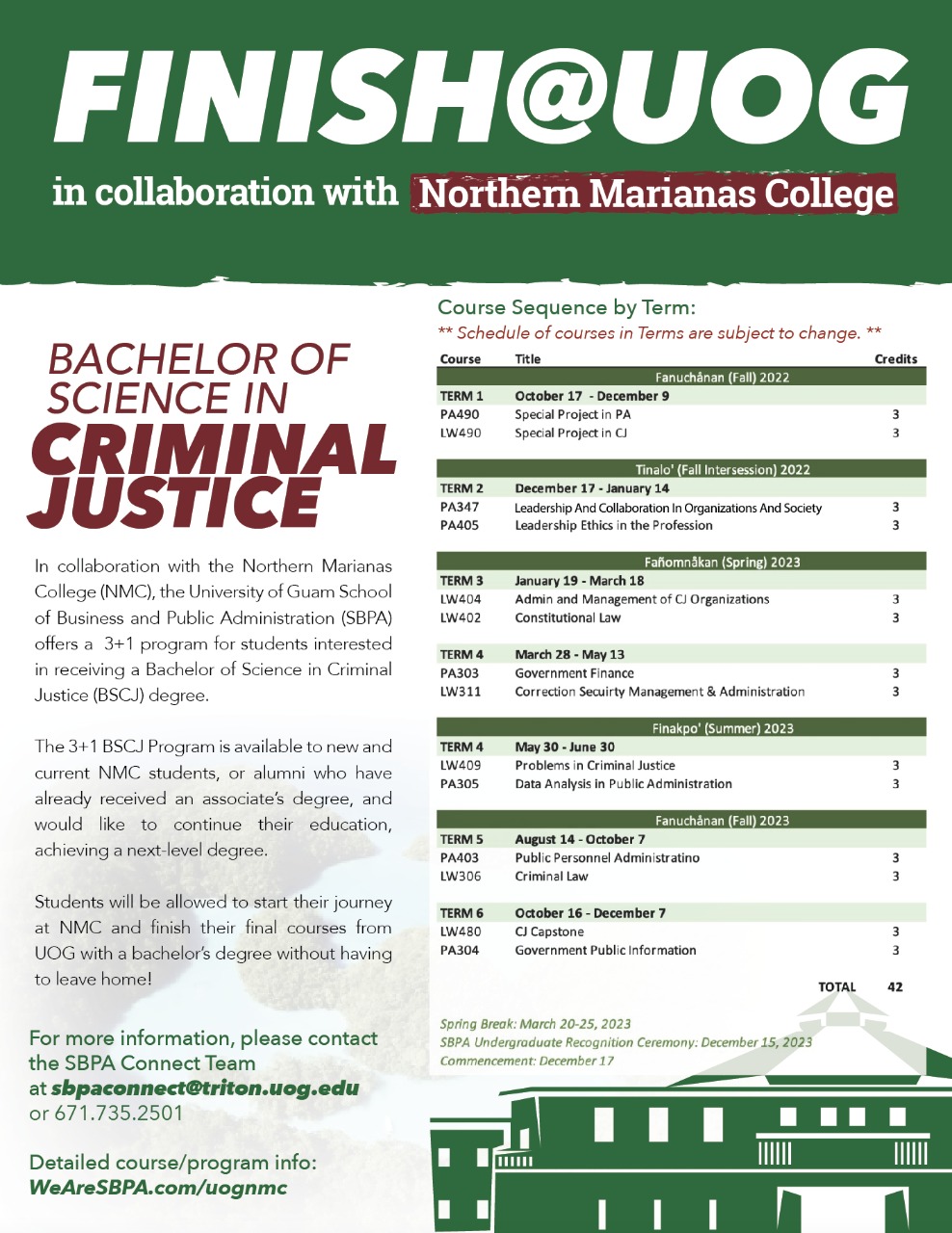 (NMC) —  In collaboration with Northern Marianas College, the University of Guam School of Business and Public Administration offers a 3+1 program for students interested in receiving a Bachelor of Science in Criminal Justice or BSCJ degree.
