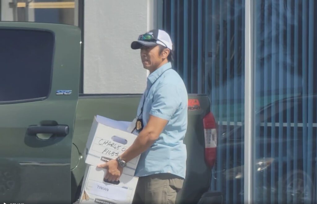 An FBI agent carries boxes of documents from Bank of Saipan on Monday.