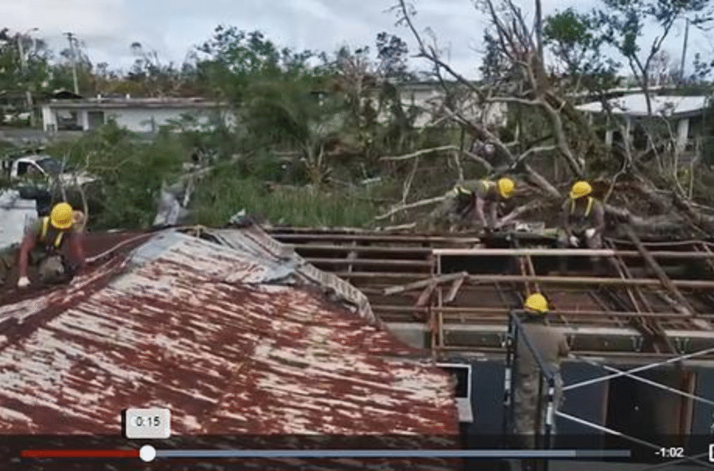 U.S. Army Reserve Soldiers assigned to the 797th Engineer Vertical Construction Company emplace metal roofing under FEMA’s Rise Up program in the wake of Typhoon Mawar.