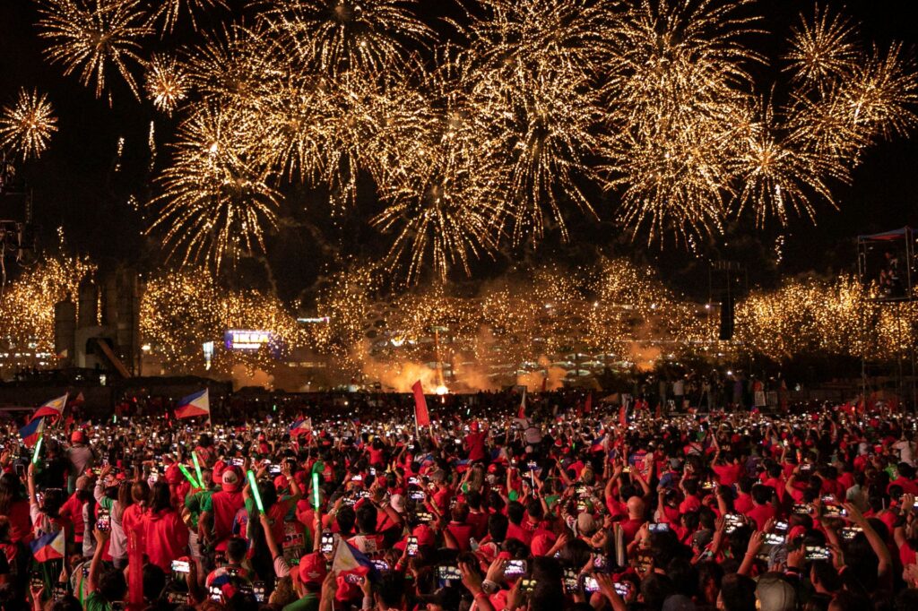 Supporters of presidential candidate Ferdinand “Bongbong” Marcos Jr., the son and namesake of the late Philippine dictator, and vice presidential candidate Sara Duterte-Carpio, daughter of Philippine President Rodrigo Duterte, watch a fireworks display during their final campaign rally before the 2022 national elections, in Parañaque City, Metro Manila on May 7, 2022.