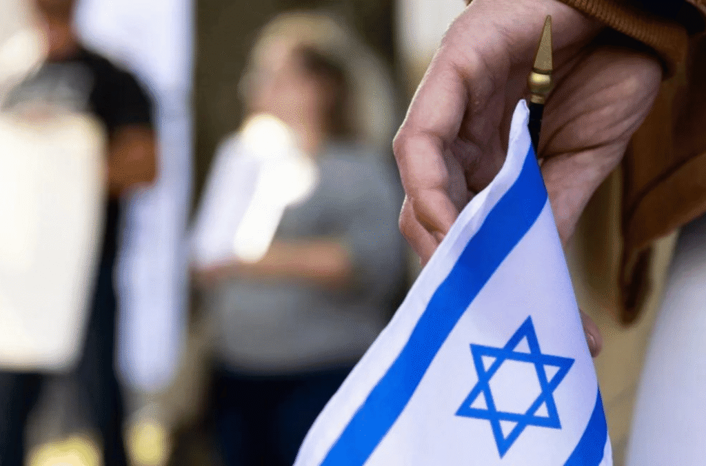 A supporter of Israel holds an Israeli flag in front of the Israeli Embassy in Washington, DC, on 8 October.