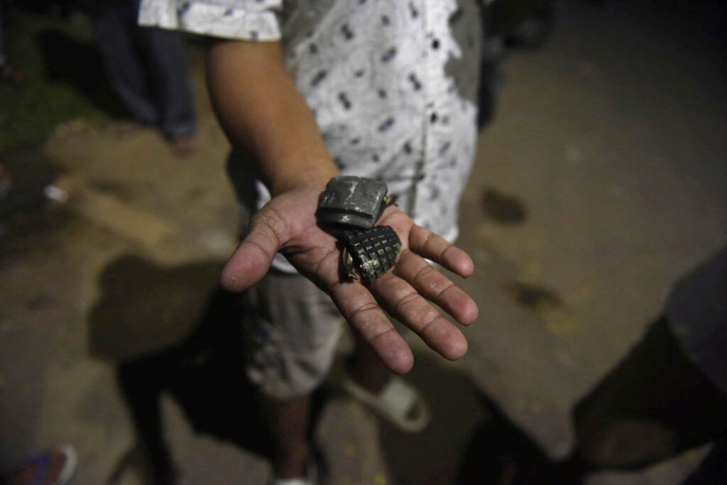 A man shows parts of grenade following a massive fire that broke out at a military ammunition facility in Bogor, on the outskirts of Jakarta, Indonesia, March 30, 2024, in this photo taken by Antara Foto.