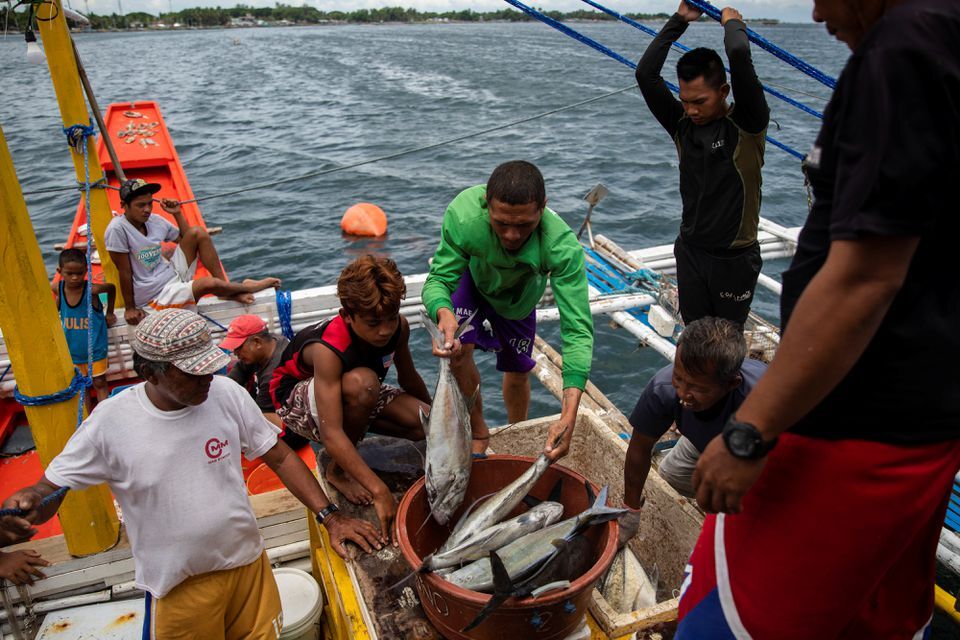 Filipino fishermen sort fish after arriving from a week-long trip to the disputed Scarborough Shoal, in Infanta, Pangasinan province, the Philippines, July 6, 2021.