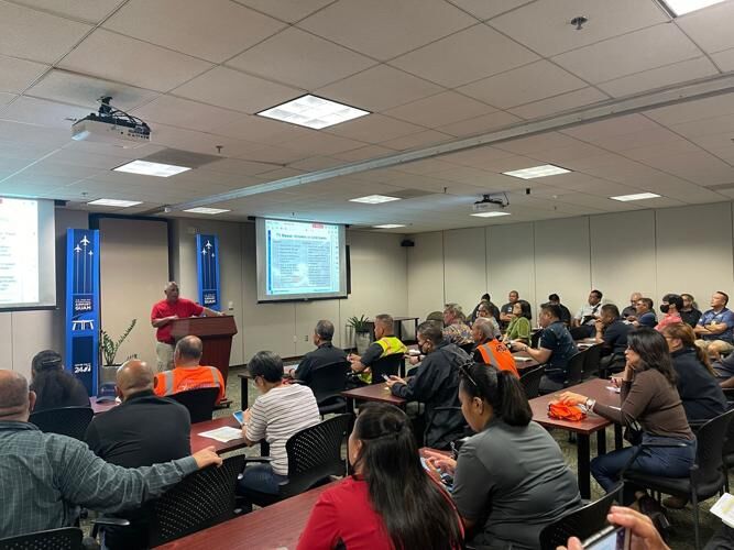 Guam International Airport Authority Executive Manager John Quinata speaks to airline officials during a heavy weather briefing Tuesday, May 23, 2023.