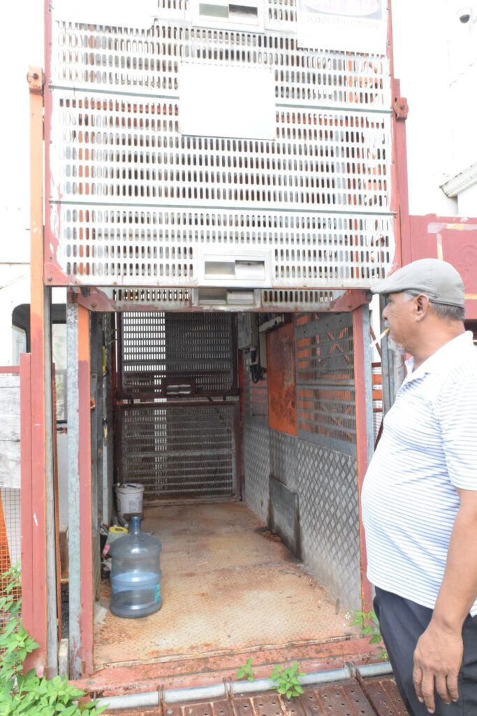 Former Imperial Pacific International construction team leader Alex Aquiningoc checks, for the last time, the elevator his team used in performing their job at the IPI construction site in Garapan.