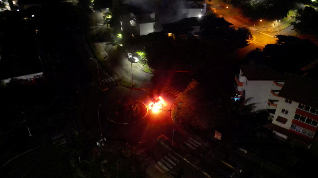 A car is seen lit on fire, amid protests against plans to allow more people to take part in local elections in the French-ruled territory, which indigenous Kanak protesters reject, in Noumea, New Caledonia, May 18, 2024 in this screengrab from video.