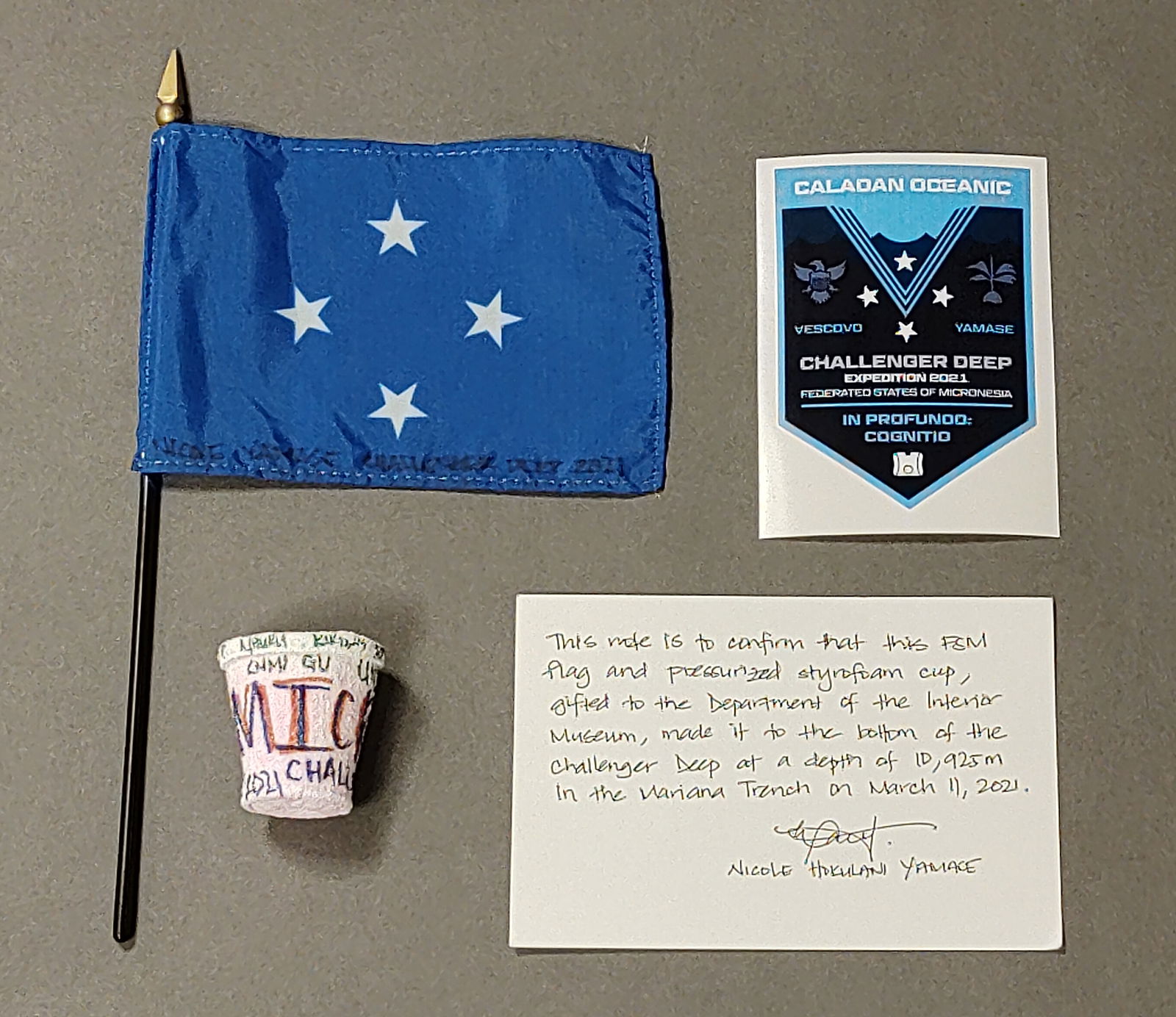 From her journey to a depth of nearly 36,000 feet (11 kilometers), Yamase has gifted a  polystyrene cup with “Micronesia,” “United We Stand,” and the names of the Micronesian islands written on it that accompanied her on the outside of the Deep Submergence Vehicle Limiting Factor and has shrunk to the size of a large thimble, visibly demonstrating the effects of ocean pressure; an autographed flag of the Federated States of Micronesia, which she carried with her inside the submersible; and badges from the mission. Yamase completed the expedition with retired U.S. Naval officer and undersea explorer Victor Vescovo.