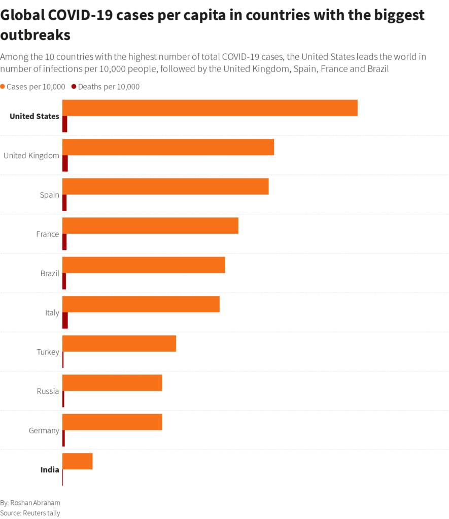 The worst-affected countries — the United States, India, Brazil, Russia and the United Kingdom — make up more than half all reported Covid-19 cases but represent 28% of the global population, according to a Reuters analysis.