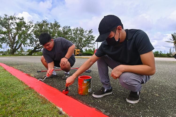 Summer interns Richard Seidler, 16, and Aron Fernandez, 16, paint the curb at M.U. Lujan Elementary School on Tuesday, Aug. 1, 2023, in Yona. Gov. Lou Leon Guerrero signed into law four measures that will allow public schools to open by Aug. 23.