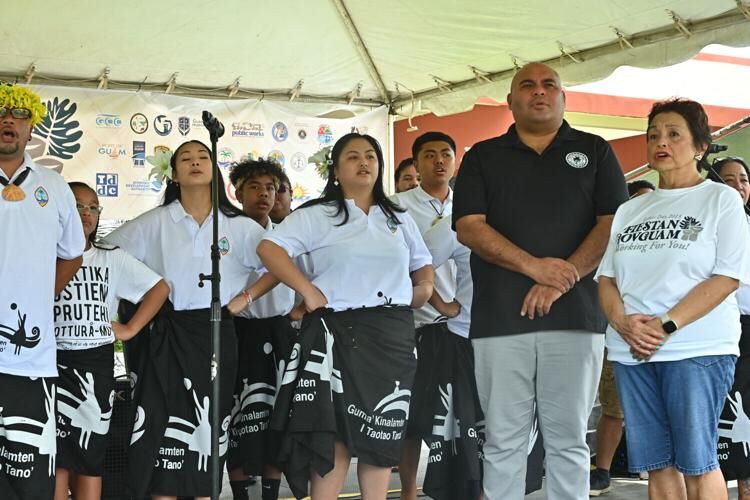 Gov. Lou Leon Guerrero, far right, and Lt. Gov. Josh Tenorio join members of Guma’ Kinalamten I Taotao Tano’ performing at the start of the Labor Day 2023 Fiestan GovGuam Picnic Sunday at Gov. Joseph Flores Memorial Park in Tumon.