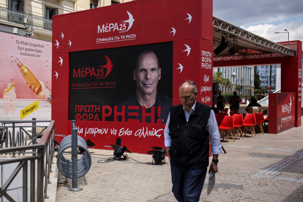 A man walks past the pre-election kiosk of the MeRA25 party, depicting the party’s leader Yanis Varoufakis, in Athens, Greece, May 18, 2023. REUTERS/Stelios Misinas